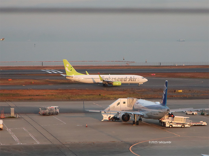At that moment, Solaseed Air Flight 61 (SNA61), a Boeing 737-800 bound for Miyazaki, was taxiing along the parallel taxiway. Passengers seated on the left side, in the F seats, may have seen the warm glow of the short-lived sunset.